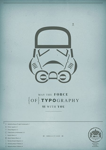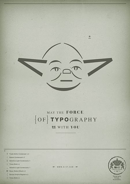 Uniquement réalisées à partir de caractères typographiques (notamment Helvetica, Times, Bodoni et et Rockwell), cette série de trois affiches conçue par l’agence de design graphique milanaise H-57 s’inspire de personnages de la saga Star Wars pour évoquer la “force” de la typo… et au passage faire connaitre un peu le travail de l’agence!