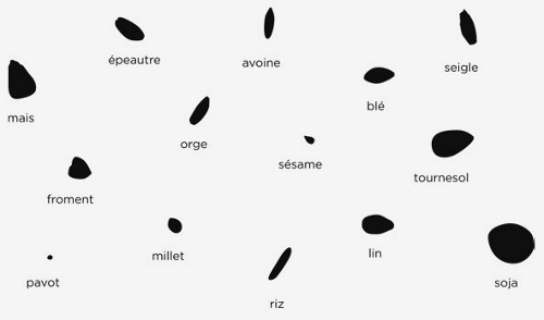 Un projet tout en simplicité, très graphique, qui se base notamment sur la forme des graines des différentes céréales déclinées en différents motifs irréguliers.