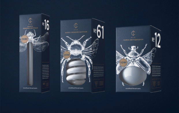La graphiste biélorusse Angelina Pischikova a imaginé pour la marque CS Lightbulbs une série de packagings mêlant illustration et imagination. Pour créer ces emballages, elle s’est directement inspiré de la forme des ampoules vendues pour en faire des thorax d’insectes dessinées à la perfection. Les illustrations et le produit ne font alors plus qu’un pour devenir ce superbe travail créatif.