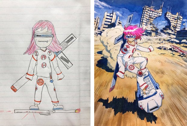 Illustrateur dans l’animation, Thomas Romain réalise de superbes illustrations en se basant sur les dessins de son jeune fils. Sur leur chaîne Youtube father/son art les deux artistes racontent et montrent comment d’un dessin réalisé avec toute l’imagination et la créativité d’un enfant, un père talentueux et expérimenté transforme ces croquis en œuvres d’art.