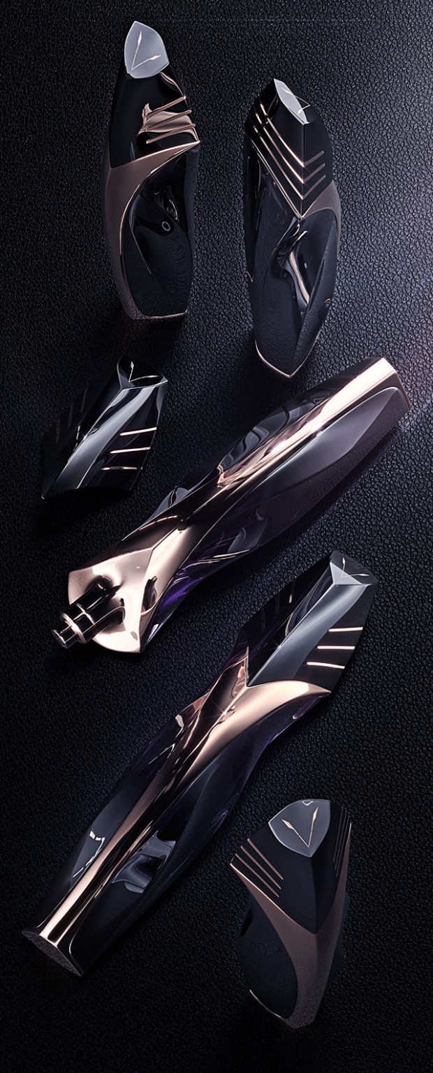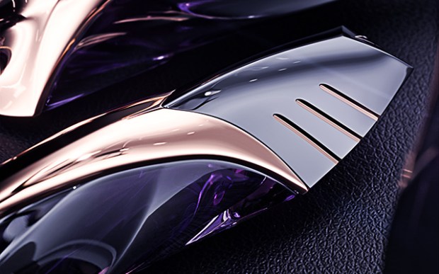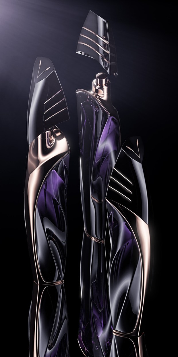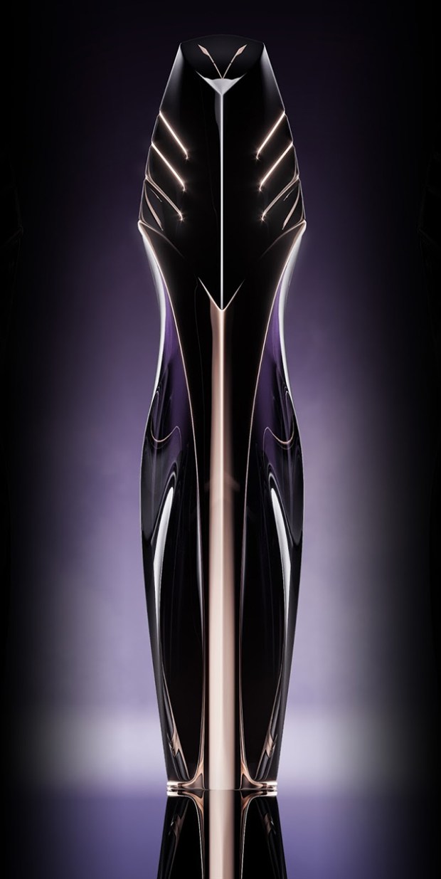 Ici, c’est en verre et en métal que se dessine la divinité avec une superbe alternance donnant une réelle profondeur à la création. Le créatif propose de teinter les parties métalliques d’un ton or rose et le verre de couleur pourpre tirant vers le noir. Le résultat est très soigné, entre tradition et modernité, tant il nous évoque les incursions du cinéaste Ridley Scott dans la science-fiction, et notamment le film Prométheus !
