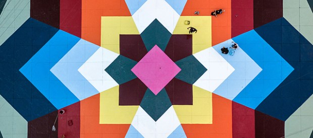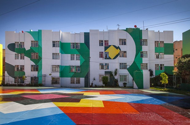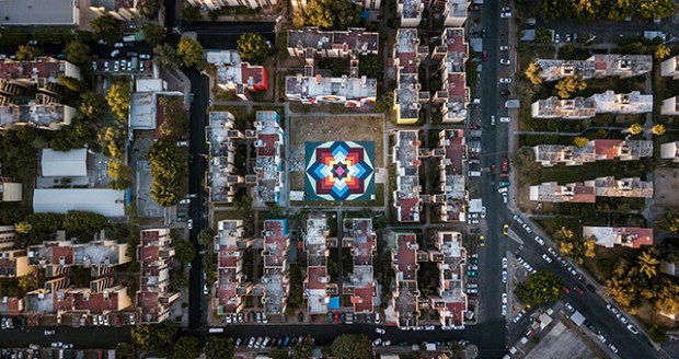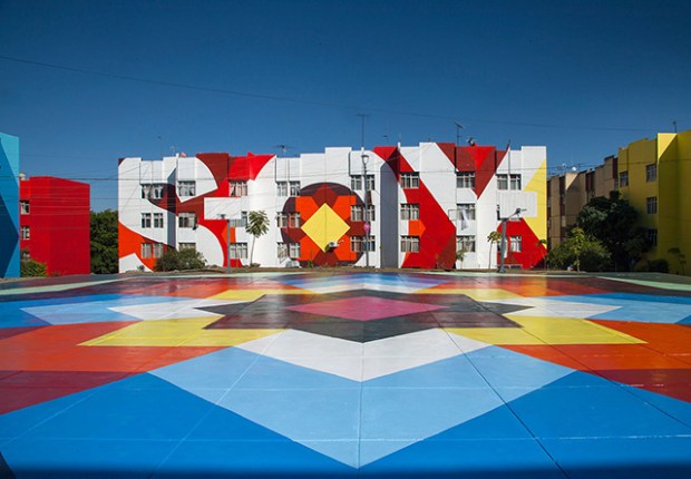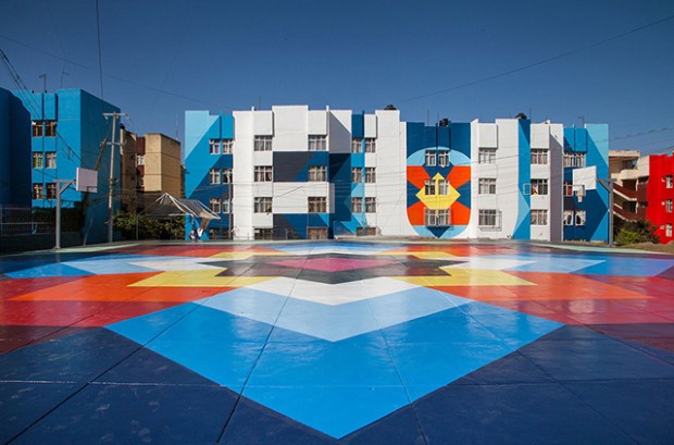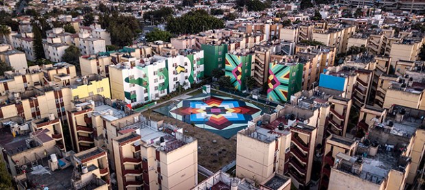 Le collectif d’artistes espagnols Boa Mistura vient de terminer Nierika. Un projet artistique qui s’invite au cœur d’un quartier de la ville de Guadalajara, au Mexique. Presque 5000 m² de peintures réparties entre trois bâtiments, deux façades et une immense esplanade. Un travail graphique et coloré pour redonner de la joie aux habitants de tout un quartier. Fondé en 2001 par une équipe pluridisciplinaire, aux racines venues du graffiti, le collectif Boa Mistura intervient essentiellement dans l’espace public. Il considère que l’art est un outil pour transformer la rue et créer des liens entre les populations. Pour ce projet au Mexique, le processus a commencé en janvier 2017, lorsque Boa Mistura a décidé de s’inspirer des motifs traditionnels des Huichol (ou Wixáritari) un peuple indigène du centre du pays. Sur les façades, les mots «j’étais», «je suis» et «je serai», viennent représenter l’identité mexicaine.