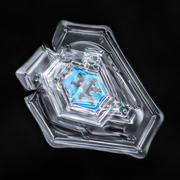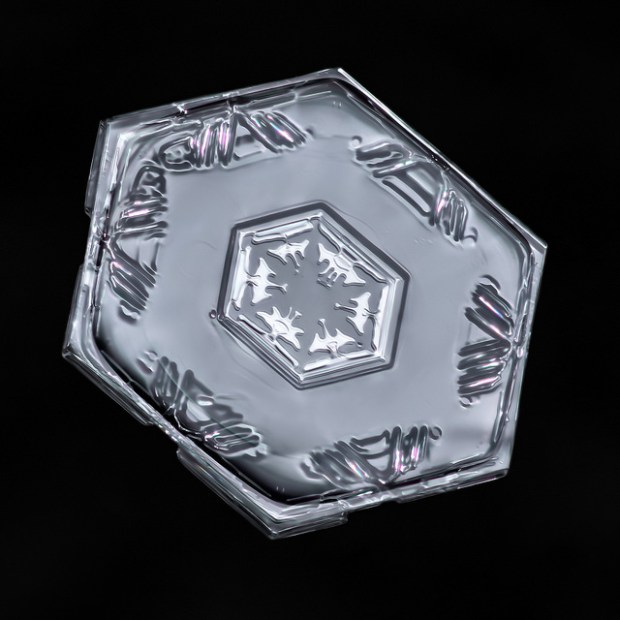 The entire crystal cannot be completely in focus in any one frame, so multiple images are used to put the final photograph together. 30-50 images on average are used in the creation of the snowflake photograph, though hundreds of images are taken to ensure that no slice of focus is missed. Each snowflake is shot entirely handheld, without the use of a tripod. The images are created outdoors in cold temperatures so the snowflakes do not melt, and only the freshest snow will do; Snowflakes that have been resting for even an hour will begin to lose their delicate crystalline features. Timing is everything! »