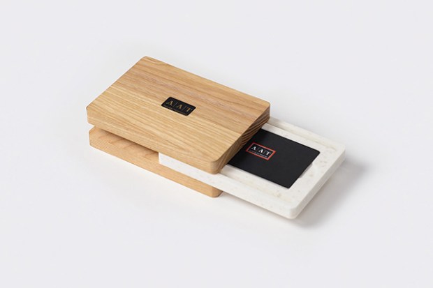 Cette boite a été réalisée pour recevoir les pour les cartes-cadeaux du magasin de Saint-Pétersbourg DLT, une enseigne de luxe. Cela explique le choix des matériaux nobles, deux lamelles de bois qui enserrent une petite plaque de marbre évidée, qui glisse pour laisser apparaître la carte. Une réalisation sobre et très originale.