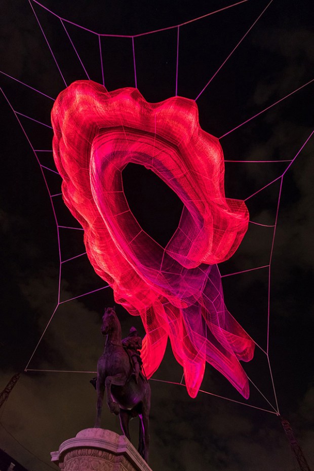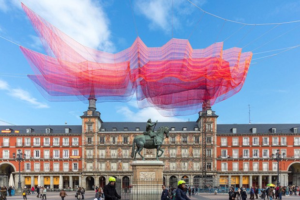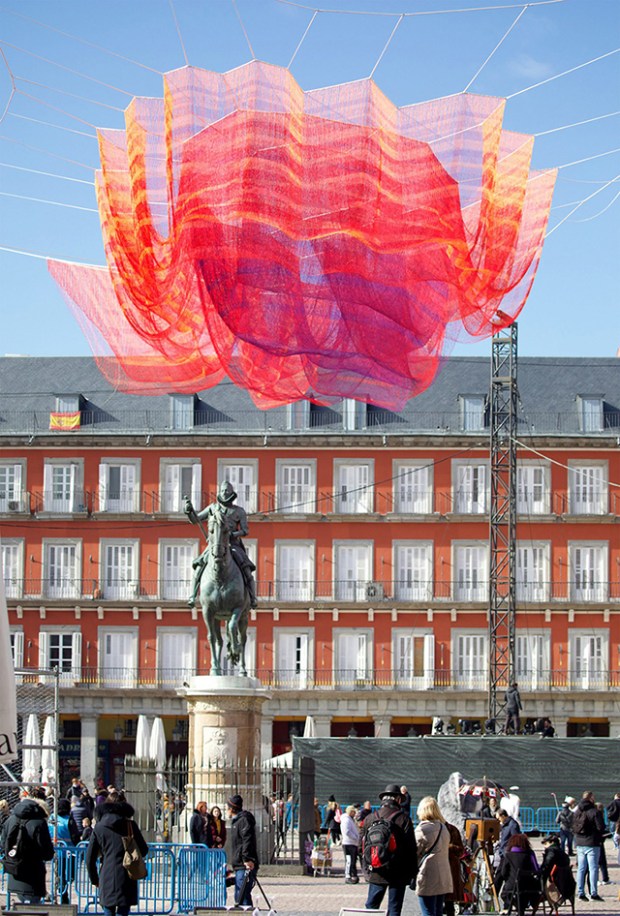 La ville de Madrid a célébré les 400 ans de la Plaza Mayor en commandant une installation à l’artiste américaine Janet Echelman. La création baptisée « 1.78 Madrid » explore les cycles du temps, s’intégrant à la série « Earth Time » initiée en 2010 par l’artiste. Une intervention sculpturale et colorée qui se meut au rythme du vent et des intempéries.