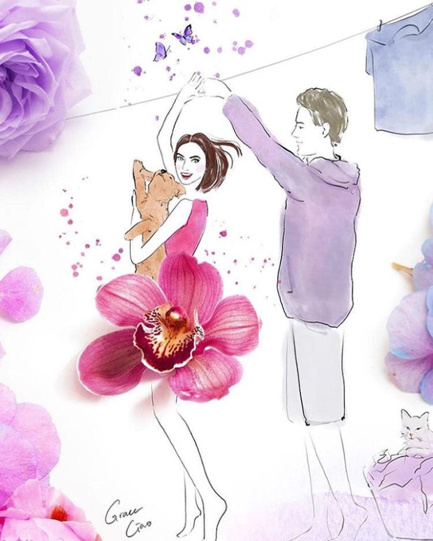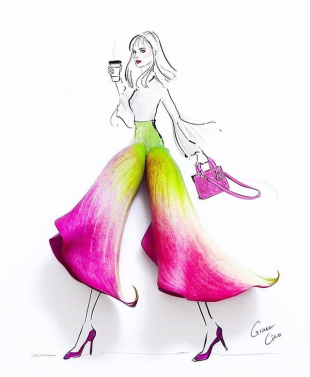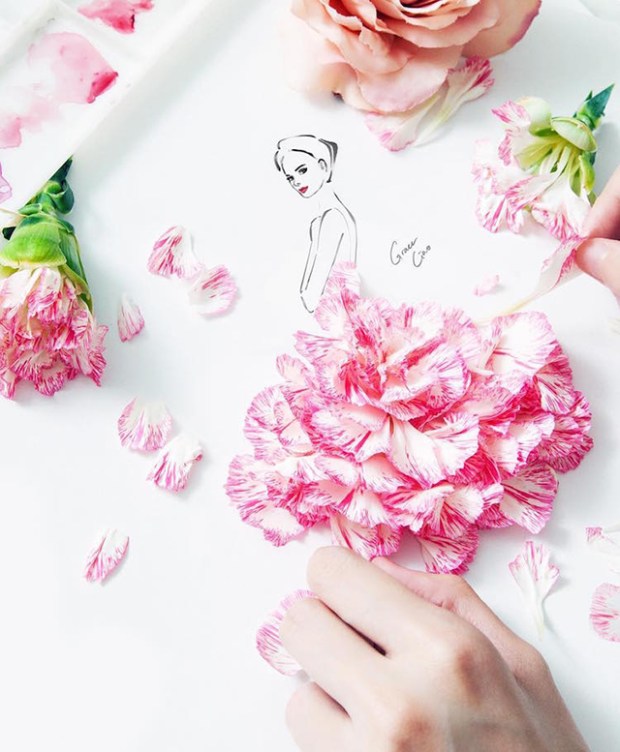 Initialement formée en marketing, l’artiste Grace Ciao combine son talent en dessin et en aquarelle pour offrir ses services aux plus grandes marques de modes. Pour ses clients, elle réalise de superbes illustrations de mode en y ajoutant des pétales de fleurs. Un travail très délicat qui a séduit les plus grands noms de la mode, comme les maisons Chanel, Christian Dior et Fendi. Basée à Singapour, Grace Ciao mêle des lignes fines dessinées à la main, de l’aquarelle et donc des pétales de fleurs qui viennent imiter le vêtement en trois dimensions. La fleur devient alors la robe, une approche très originale et délicate. L’idée est venue à l’artiste par hasard, en voyant une rose flétrie sur son bureau. Plutôt que de la jeter, elle lui a donné une nouvelle vie en combinant ses pétales dans une illustration de mode. L’artiste explique que l’inspiration est guidée par les fleurs, leurs formes, couleurs et textures guide sa main lors de la réalisation de ses illustrations.