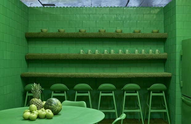 L’artiste a longtemps cherché la maison parfaite pour y exposer ses œuvres, mais sans succès. La solution est alors apparue, il suffisait de la construire ! C’est donc au milieu d’un hangar totalement délabré qu’avec 12 000 blocs de plastique (semblables à de gros LEGO) que l’artiste a bâti les murs et les différentes pièces de sa maison. Chacune d’elle se pare d’une couleur spécifique et est traitée de manière totalement monochrome. Une saturation de couleur qui s’étend sur 7 salles, aménagées comme les pièces d’une véritable habitation. Le concept est tellement poussé que l’artiste s’est évertuée à concevoir chaque espace en s’inspirant des œuvres exposées sur les murs.
