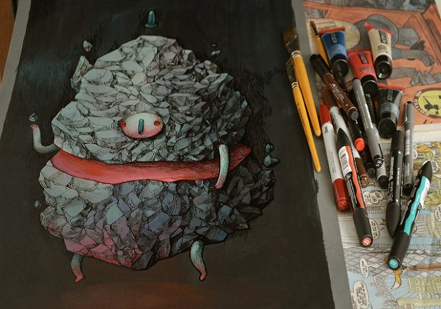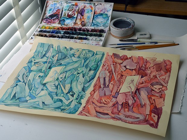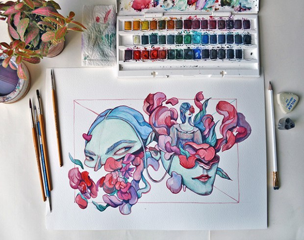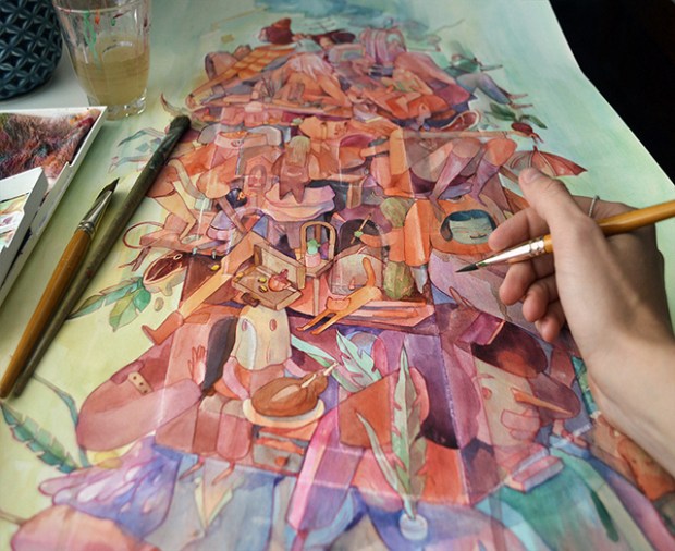 Par ailleurs, l’artiste illustratrice réalise aussi des aquarelles bouillonnantes qui nous plonge dans un monde peuplé de personnages étranges et mystérieux. Des oeuvres complexes qui forcent le spectateur à se perdre dans les visuels pour en extraire les éléments clés.