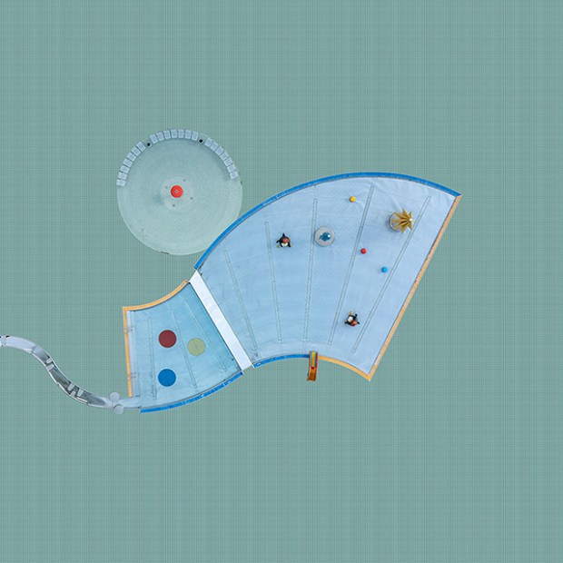Ils sont tous photographiés à la verticale par drone, puis replacés sur une trame de fond. L’objectif du concepteur allemand est de nous rappeler à quel point il est important pour les municipalités de fournir un accès public aux piscines. Il va même jusqu’à s’opposer à l’utilisation d’eau potable pour remplir des bassins chez les particuliers, estimant que l’offre publique étant largement suffisante. Avec ses drones, il réalise un très beau travail sur les perspectives qui sont renforcées par les retouches qu’il effectue sur ses photos. Il utilise les carreaux qui entourent chaque piscine pour créer un motif de mosaïque qu’il va placer comme une toile de fond uniforme.