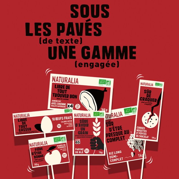 Ces nouveaux packagings misent sur la couleur rouge terre de sienne, utilisée en trame de fond sur tous les supports. Cette couleur, déjà emblématique de la marque est celle utilisée par le logo de Naturalia. Une approche cohérente qui a le mérite de couper avec le vert traditionnellement associé à l’écologie et au bio. Par ailleurs, sur un plan d’analyse de la couleur, le choix du rouge transmet des valeurs chaleureuses, énergiques, mais aussi militantes. Un choix qui correspond parfaitement aux valeurs que la marque souhaite véhiculer.
