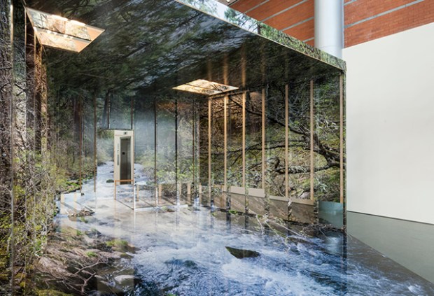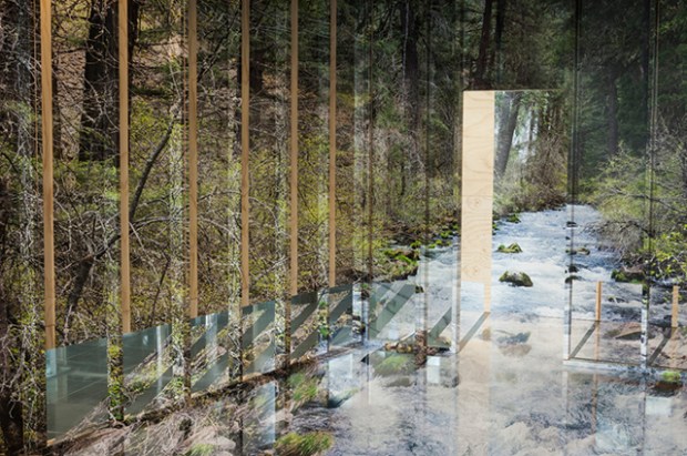 Un ruisseau bucolique, traversant une forêt qui s’étend jusqu’à la cime des arbres. Voici où nous transporte l’artiste dans cette installation. Des photographies directement appliquées à la surface des murs de cette installation temporaire d’une galerie d’art de Cincinnati.