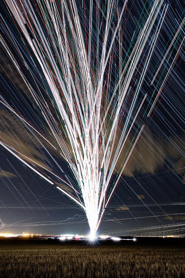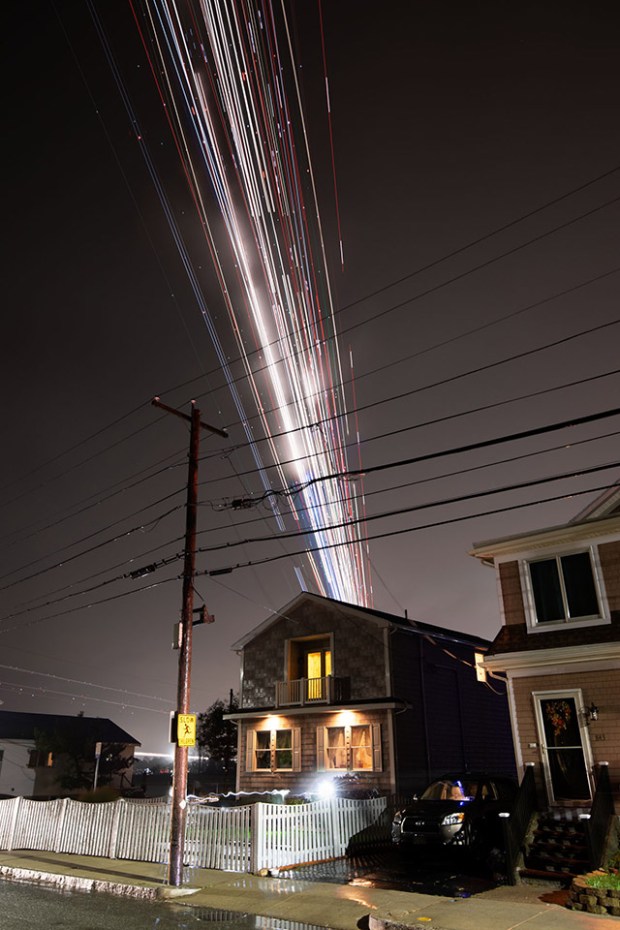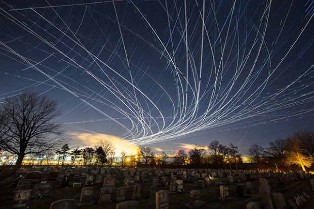 Le photographe américain Pete Mauney vient de dévoiler une série de photographies totalement déroutantes intitulée « Airports ». Pour réaliser ces clichés, l’artiste passe de longues heures à photographier les abords des aéroports avec des poses longues. Par la suite, il superpose chaque photographie pour obtenir des composites fascinants dans lesquels le ciel nocturne est rempli de traînées lumineuses laissées par les avions.
