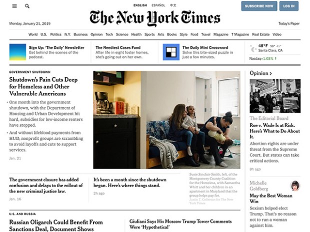 Le site Web du New York Times a beaucoup évolué pour ressembler de plus en plus à un journal imprimé. Un webdesign basé sur un texte noir et sobre, ainsi qu’une disposition en 4 colonnes.