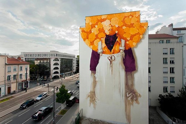 Revenons au travail de l’artiste Inti, qui est actuellement considéré comme l’un des muralistes les plus talentueux du moment. Inti – ce qui veut dire “soleil” en langue quechua – se fait rare et refuse les invitations depuis plus d’un an, privilégiant désormais la peinture sur toiles et les sculptures, mais ce dernier a accepté l’invitation du festival lyonnais. Pour l’occasion, il a habillé la façade d’un immeuble jouxtant la halle Debourg, dans le 7ème arrondissement d’un portrait monumental. Une peinture murale aux accents floraux et aux teintes oranges et violettes. Le personnage semble être un tailleur, avec sa paire de ciseaux pendue autour du cou. Une myriade de fleurs orangées recouvrent le visage du personnage, tandis que son cou violacé semble abriter une galaxie d’étoiles… Un travail qui capte el regard par ses couleurs et la grande poésie qui s’en dégage.