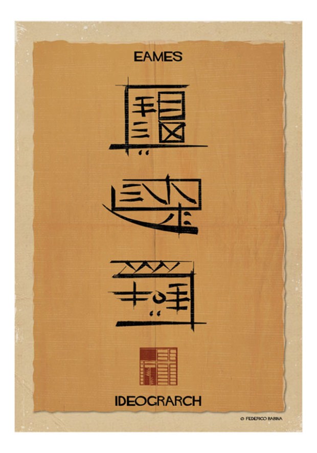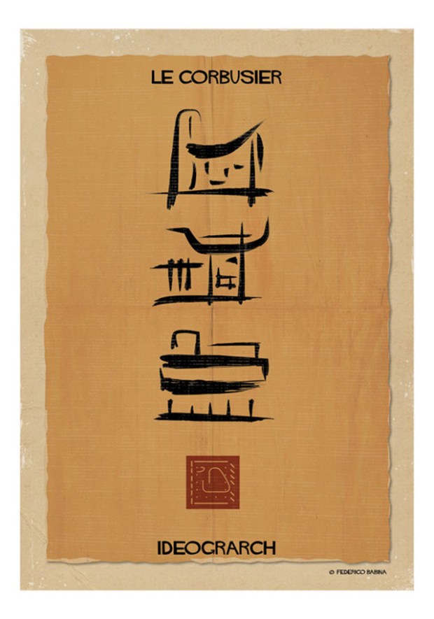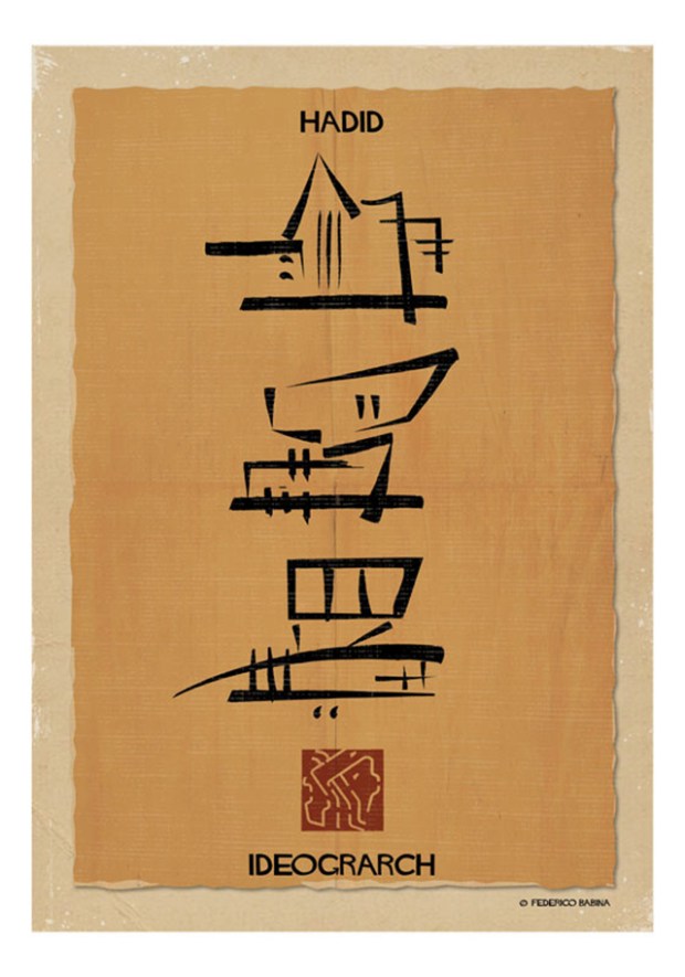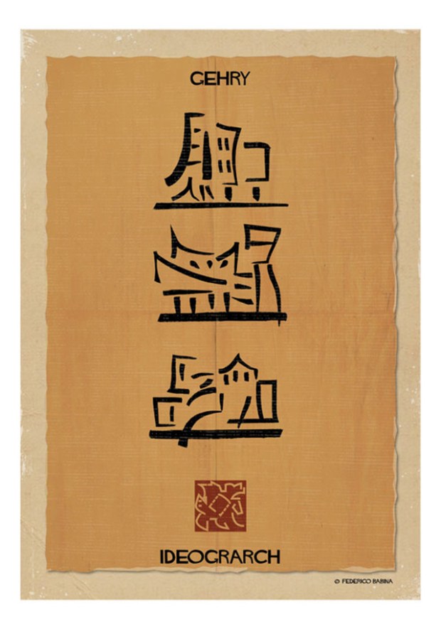 Architecte et designer graphique installé à Barcelone, l’italien Federico Babina a imaginé une série de créations baptisée « Ideograrch ». Un travail autour des kanjis, de la calligraphie et de la typographie, où l’artiste transforme des œuvres architecturales emblématiques en un catalogue d’idéogrammes à la gloire d’architectes iconiques, Du Corbusier à Zaha Hadid en passant par Frank Gehry…