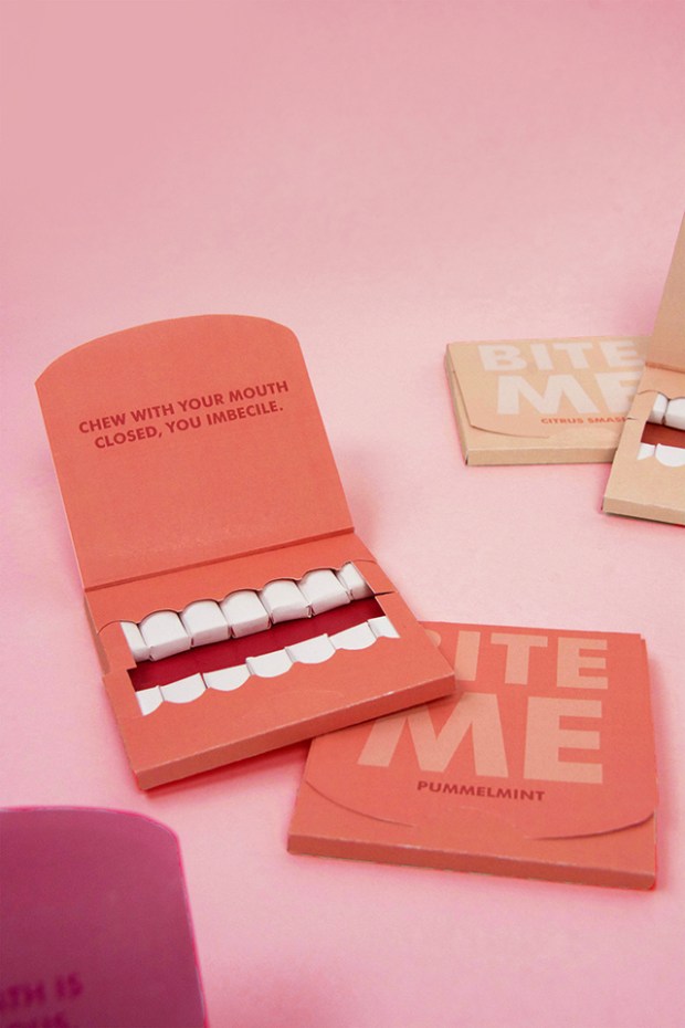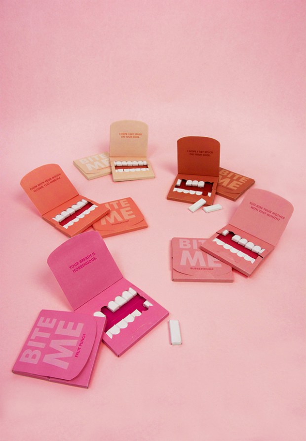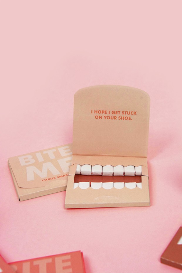 Pour imaginer ce concept de packaging, l’artiste à travaillé l’ensemble de son projet. Du concept au graphisme en passant par la conception rédaction. L’emballage, rose et rouge prend la forme d’une bouche souriante, où chaque chewing-gum représente une dent. Au fur et à mesure qu’ils sont consommés, la dentition se clairsème et renforce les messages légèrement insultants qui figurent sur le rabat de l’emballage, comme par exemple “Your breath is horrendous”, que l’on pourrait traduire par « Ton haleine est horrible » !