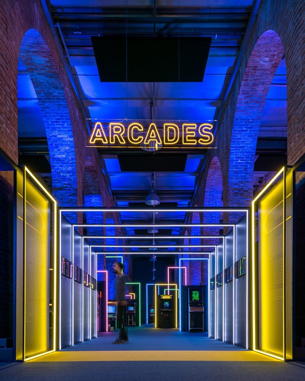 Cette rétrospective de l’histoire du jeu vidéo présentait plus de 400 objets de collection et de dessins qui témoignent de l’évolution du media des années 60 à nos jours. De très nombreuses bornes d’arcades permettaient de découvrir ou redécouvrir les icones du secteur, de Space Invaders à Pokemon en passant par Tetris, les Sims ou Fifa. Mais ce qui nous intéresse aujourd’hui, c’est bien la manière dont les designers ont imaginé l’espace pour transporter les visiteurs dans le monde du jeu vidéo. Pour cela, l’espace est plongé dans une pénombre bleutée, illuminée par des tubes LED multicolores suspendus dans tout l’espace d’exposition. Dans un espace en sous-sol et parsemé d’arches, les scénographes ont démultiplié cet élément architectural en ajoutant de nouvelles arches de néons colorés. Ces tubes sont un clin d’œil aux graphismes des premiers jeux vidéo où de simples lignes de couleurs sur fond noir faisaient office d’environnements. Disposées en arcs et tunnels, comme des éléments architecturaux, ces LED dictent les circulations et les délimitent les différentes zones de l’exposition. Ces lignes viennent créer des perspectives et l’illusion d’un espace en 3D, alors même que tous les éléments sont bidimensionnels.