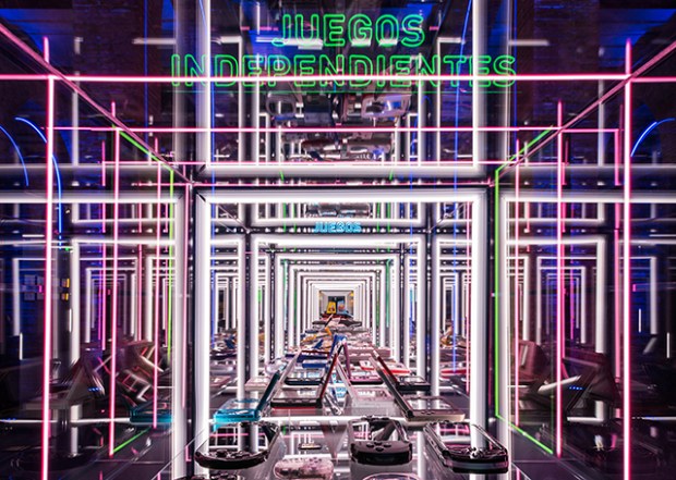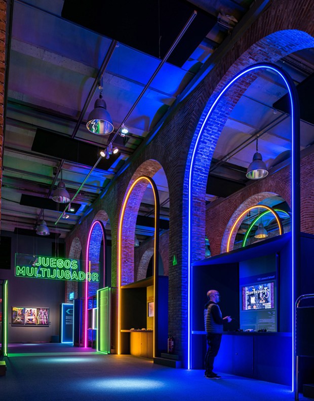 Direction Madrid où a eu lieu l’exposition Game On, un retour sur le jeu vidéo et son histoire. Pour scénographier l’espace, l’agence de création Smart & Green Design a imaginé une scénographie cyberpunk qui plonge le visiteur dans une atmosphère très ancrée dans les années 80 et leur vision du futur. Au total, ce sont plus de 150 arcs LED qui ont été installés dans l’espace d’exposition pour offrir un voyage dans le temps au visiteur.