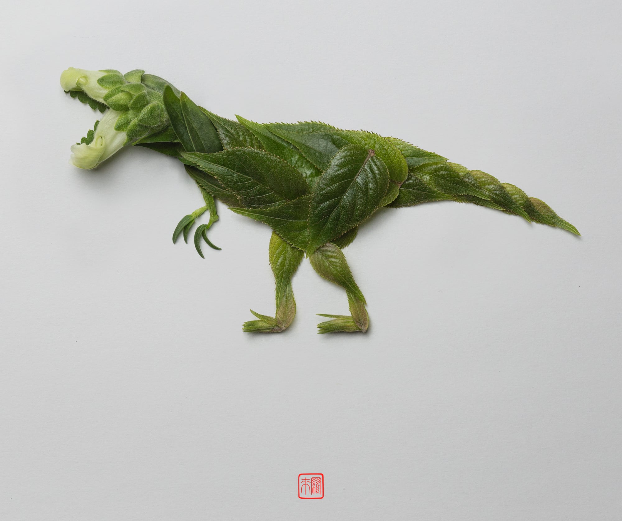 Dans sa dernière série artistique, le japonais Raku Inoue met à l’honneur les dinosaures d’une manière très originale. Il recrée les silhouettes des sauriens les plus emblématiques à l’aide de simples feuilles ! S’il a d’abord suivi une formation de dessinateur, l’artiste très complet s’est essayé à la peinture et à l’artisanat. Il a également appris la photographie numérique et ses techniques, telles que l’éclairage, la composition et la retouche post-production. C’est sans doute avec toutes ces expériences qu’il parvient à donner naissance à ces compositions extraordinaires.