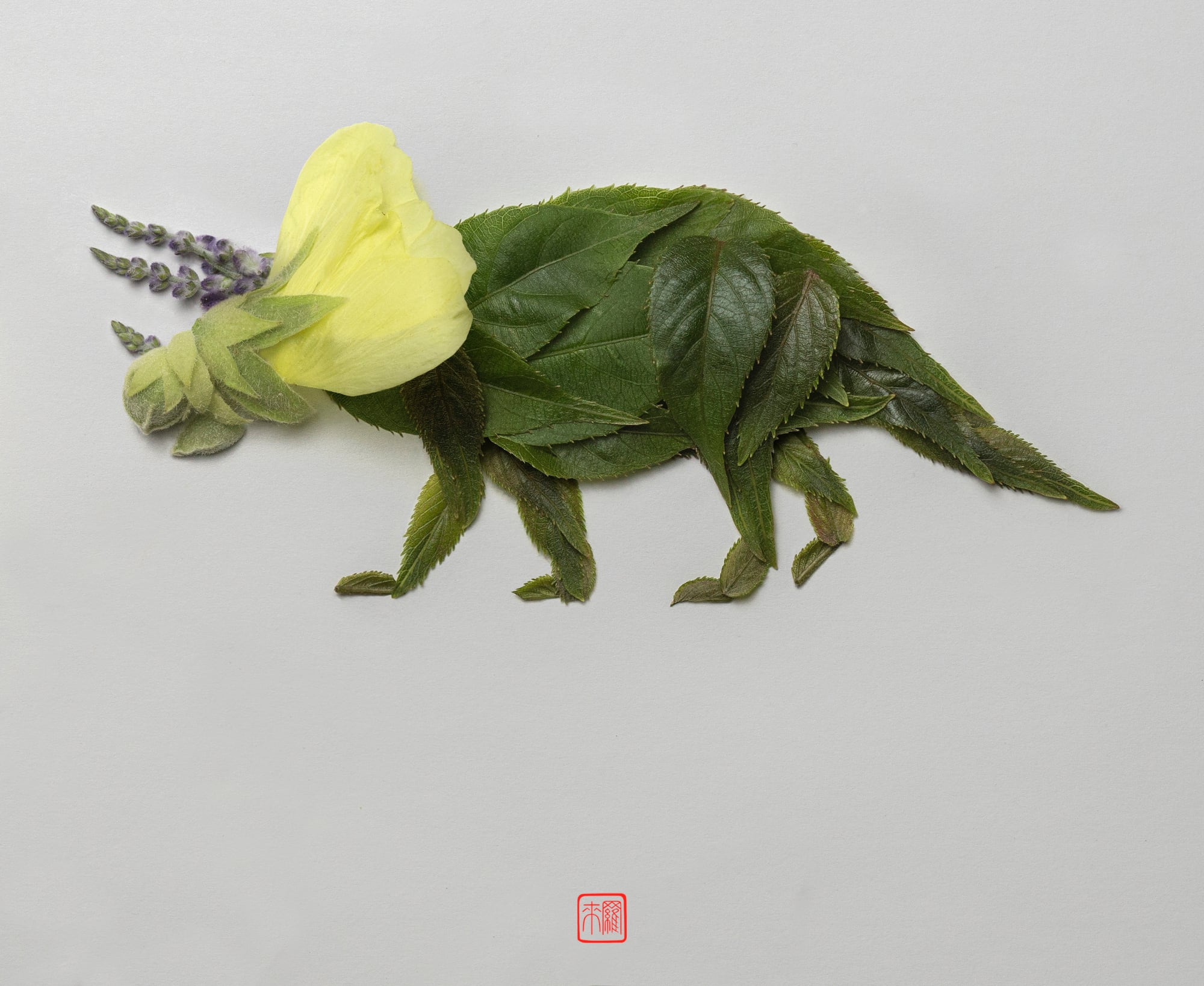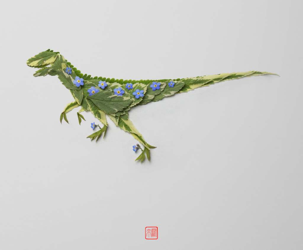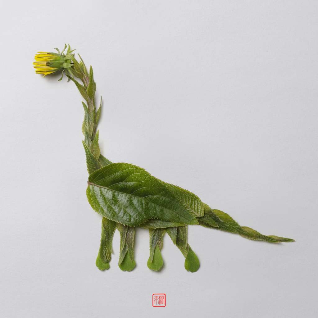 Avec la série Jurassic Nature, l’artiste mêle le feuillage de végétaux variés, de la vigne au kiwi en passant par l’épicéa blanc et l’érable. Les textures nervurées et veinées de chacune des feuilles utilisées lui permettent d’imiter la peau des reptiles et de rendre les différentes espèces créées immédiatement identifiables ! Un superbe travail qui est à la fois minimaliste dans son approche et particulièrement minutieux et complexe dans son exécution. T-Rex, stégosaure, brontosaure et vélociraptor deviennent sous sa main des créatures botaniques d’une infinie délicatesse.
