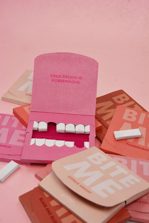 Pour débuter l’année 2020, nous vous proposons de découvrir le travail de l’artiste Zoé Schneider. Alors qu’elle vient de terminer sa formation en design graphique au sein de la prestigieuse Rhode Island School of Design, elle dévoile son concept de packaging pour une marque fictive de chewing-gums baptisée « Bite Me » dans des emballages aux allures de mâchoires édentées !