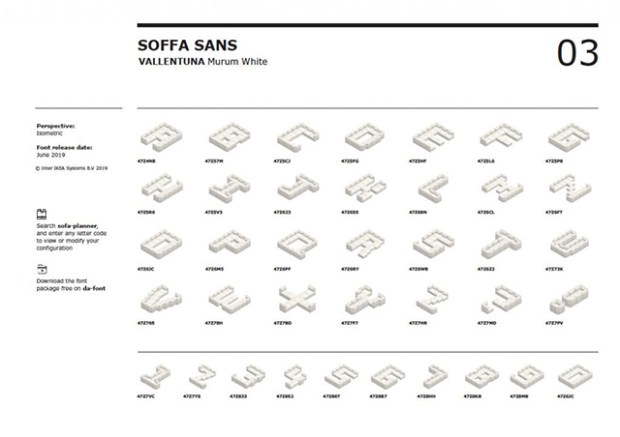 Développée par l’agence de création graphique Proximity London, la typographie Soffa Sans a été créée à partir de l’outil en ligne de création de canapés d’IKEA. Cette police de caractères, présentée par le géant suédois comme la typographie la plus confortable du monde est sans doute aussi la plus chère, car si tous les éléments qui la composent était réellement produits, la note s’approcherait des 135000 dollars !